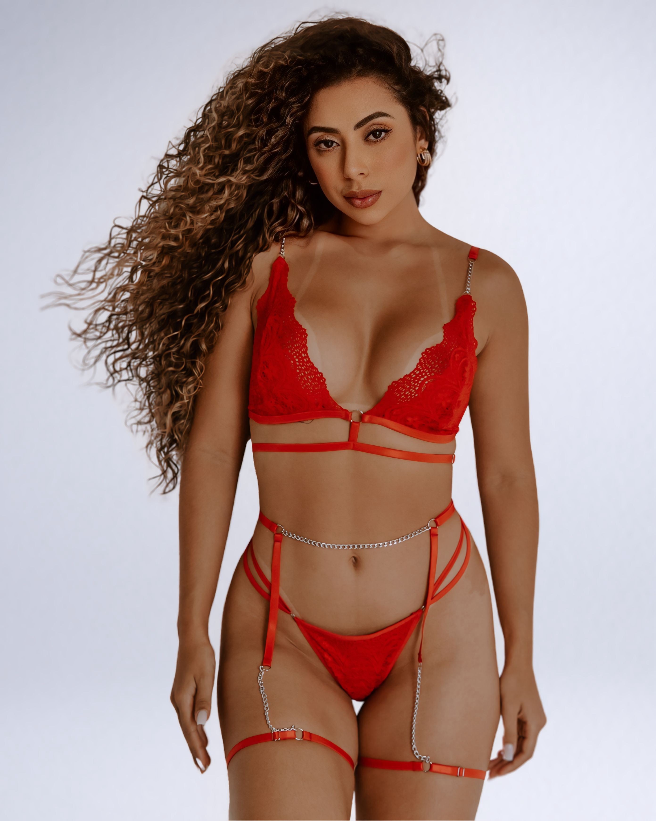 A calcinha modelo String em renda, com forro de algodão, garante conforto e um caimento irresistível. E para completar, a cinta-liga de corrente é um acessório indispensável para quem deseja um toque extra de charme na coleção de lingerie.
