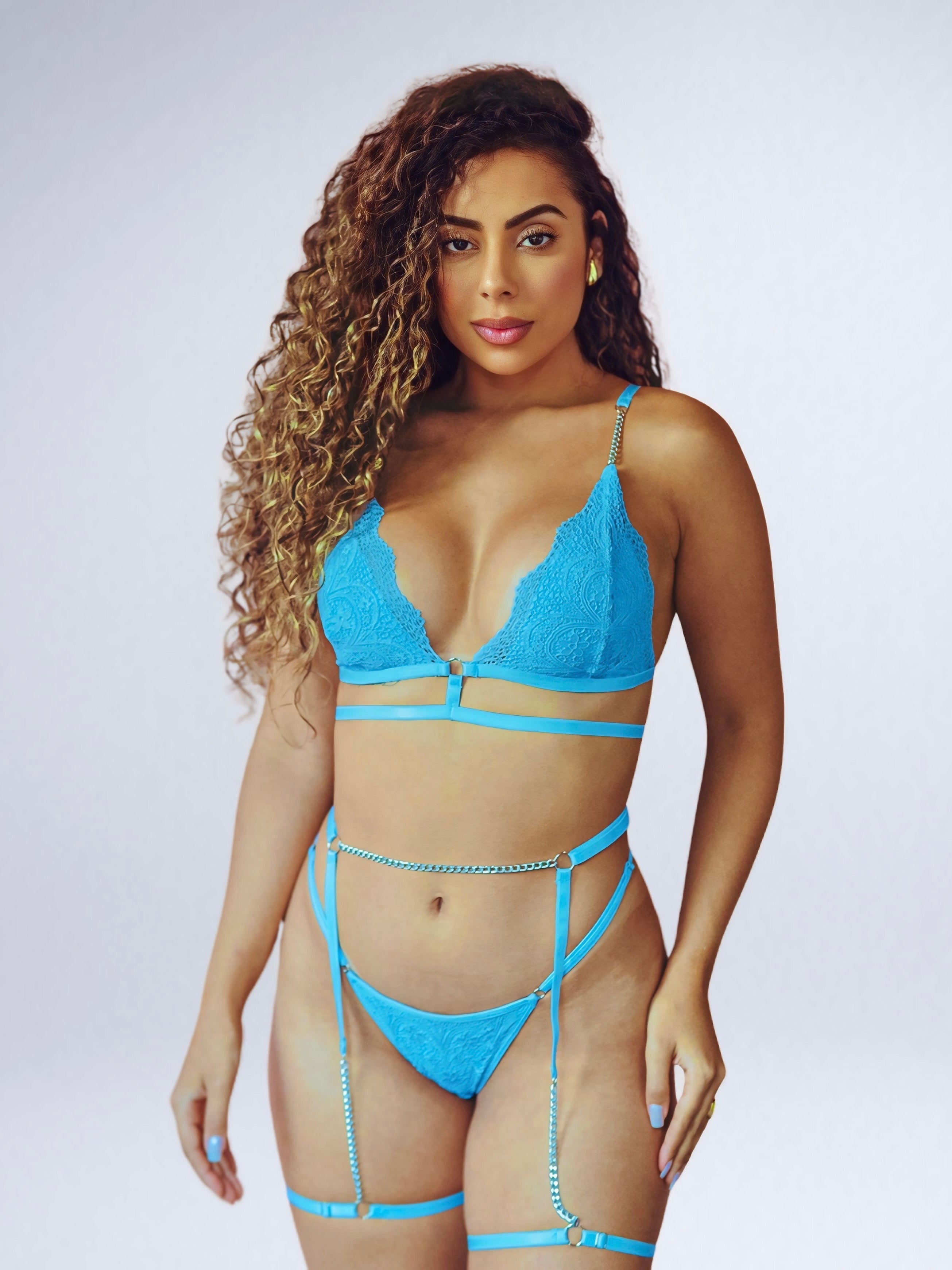 O Conjunto Bem Resolvida é uma verdadeira obra-prima da lingerie! Composto por um sutiã triangular em renda que valoriza seus seios, este conjunto é perfeito para realçar sua beleza natural. As alças com regulagem e detalhes em correntes adicionam um toque de modernidade e sofisticação.