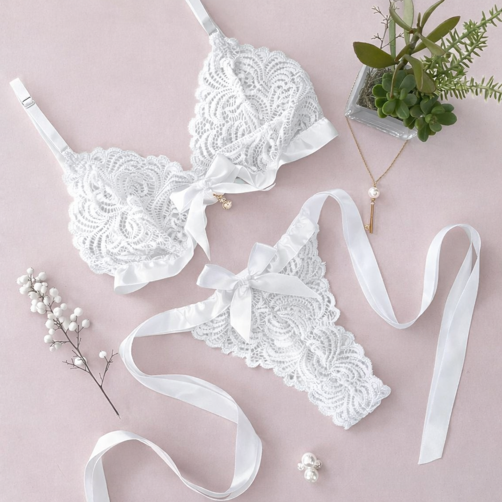 Conjunto de Lingerie 2 peças. Sutiã sem bojo desenvolvido em renda, laço de cetim no entremeio do sutiã para acabamento super delicado e pingente, sem arco. Acompanha calcinha modelo fio dental de amarrar em cetim, para ajuste perfeito ao corpo também desenvolvida em renda, forro 100% algodão.