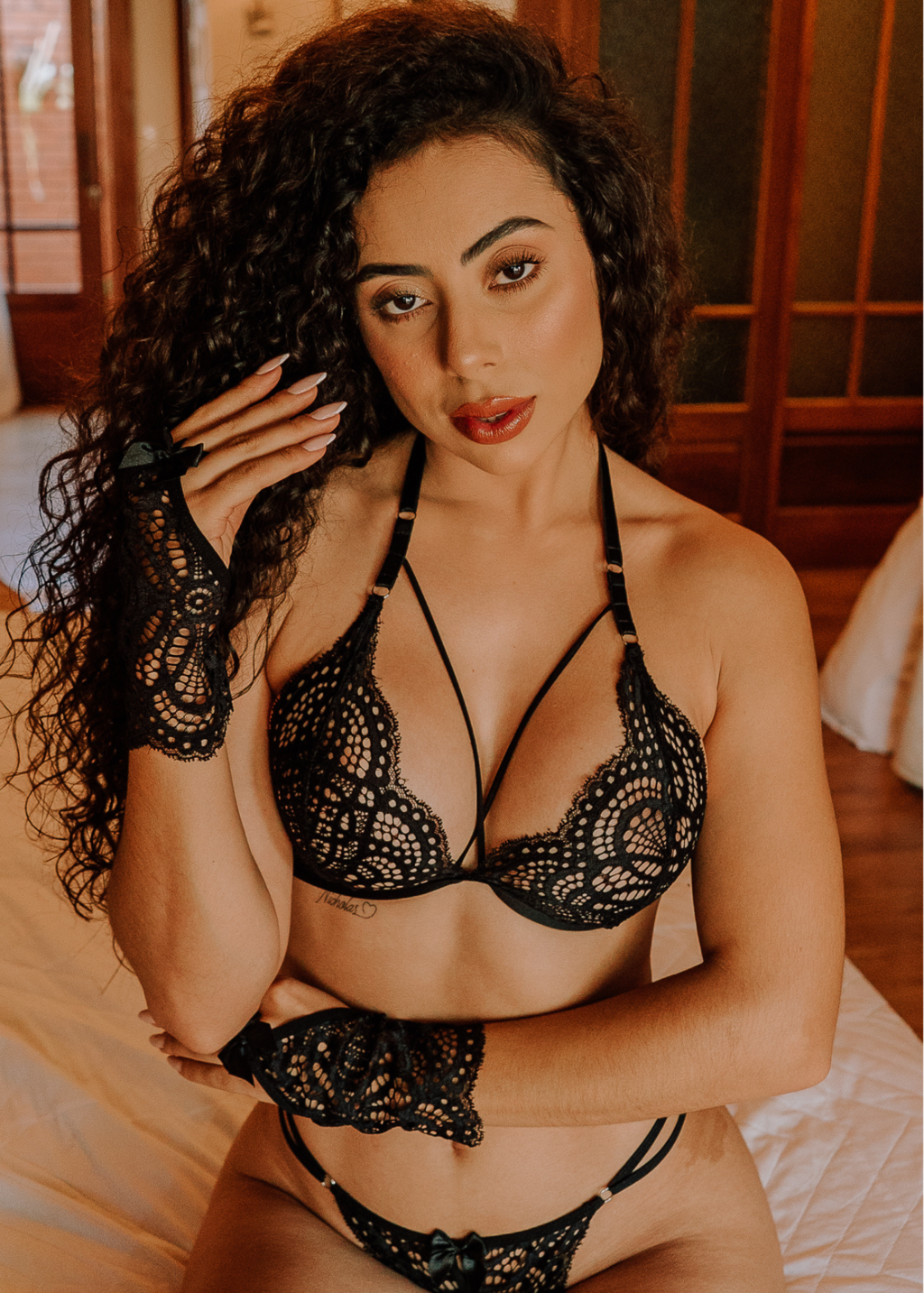 O Conjunto Rouge é a definição de ousadia e charme! Composto por 3 peças irresistíveis, ele traz um sutiã triangular desenvolvido em renda delicada, que se ajusta perfeitamente ao corpo. A calcinha modelo fio é um verdadeiro destaque, com uma abertura sensual na parte inferior que promete aquecer os momentos. Para completar, uma luva que eleva a sensualidade do visual a um novo patamar. Ideal para quem busca um toque extra de glamour.