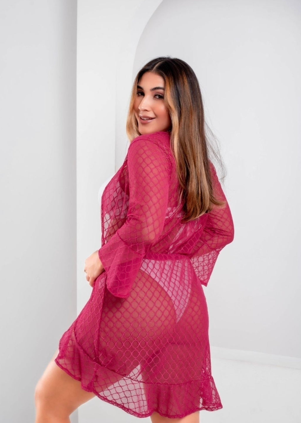 Confeccionada em tule trabalhado, mais encorpado e com toque macio, a peça oferece sofisticação e durabilidade. A transparência delicada adiciona um charme sutil, tornando-a ideal para usar sobre biquínis ou maiôs em produções leves e modernas à beira-mar.